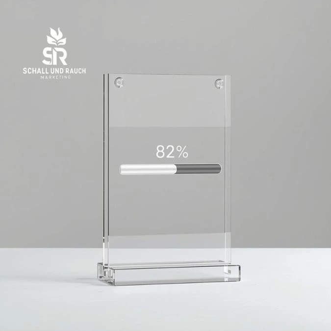 Gefertigt als hochwertiger Acryl Aufsteller zeigt sie einen Ladebalken, der konstant bei 82 Prozent steht.