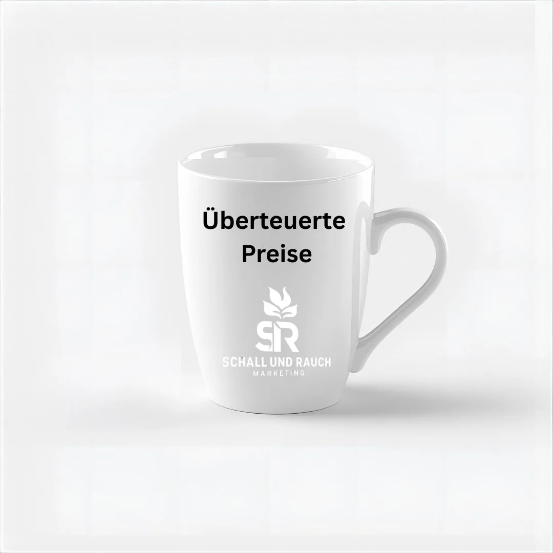 Die „Überteuerte Preise“ Tasse in Weiß. Das Porzellan gewordene Geschäftsmodell. Ideal für alle, die wissen: